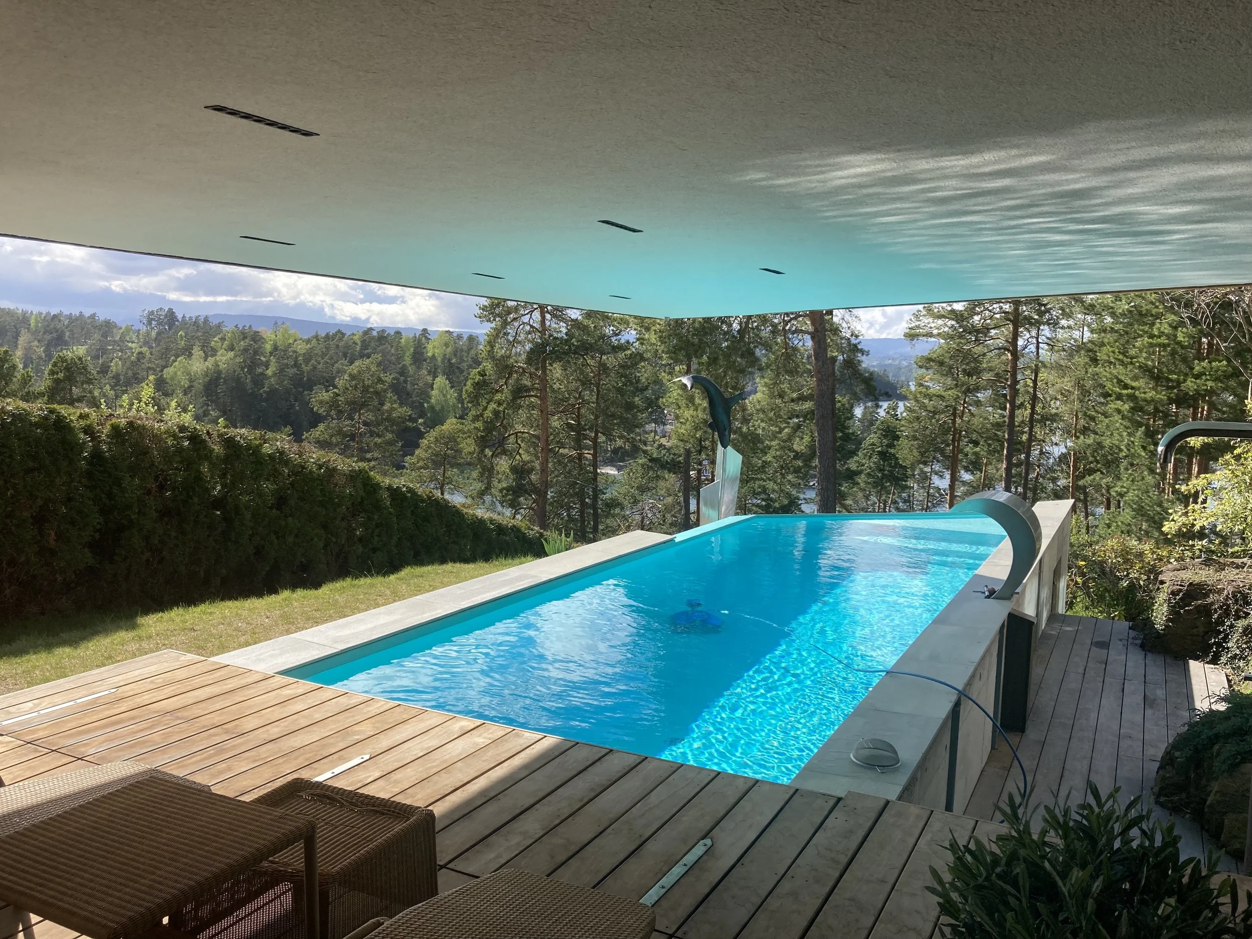 Nye ute- og ankomstkvaliteter: tørr carport, skjermet terrasse ved basseng, sømløs overgang inne–ute i vinterhagen.